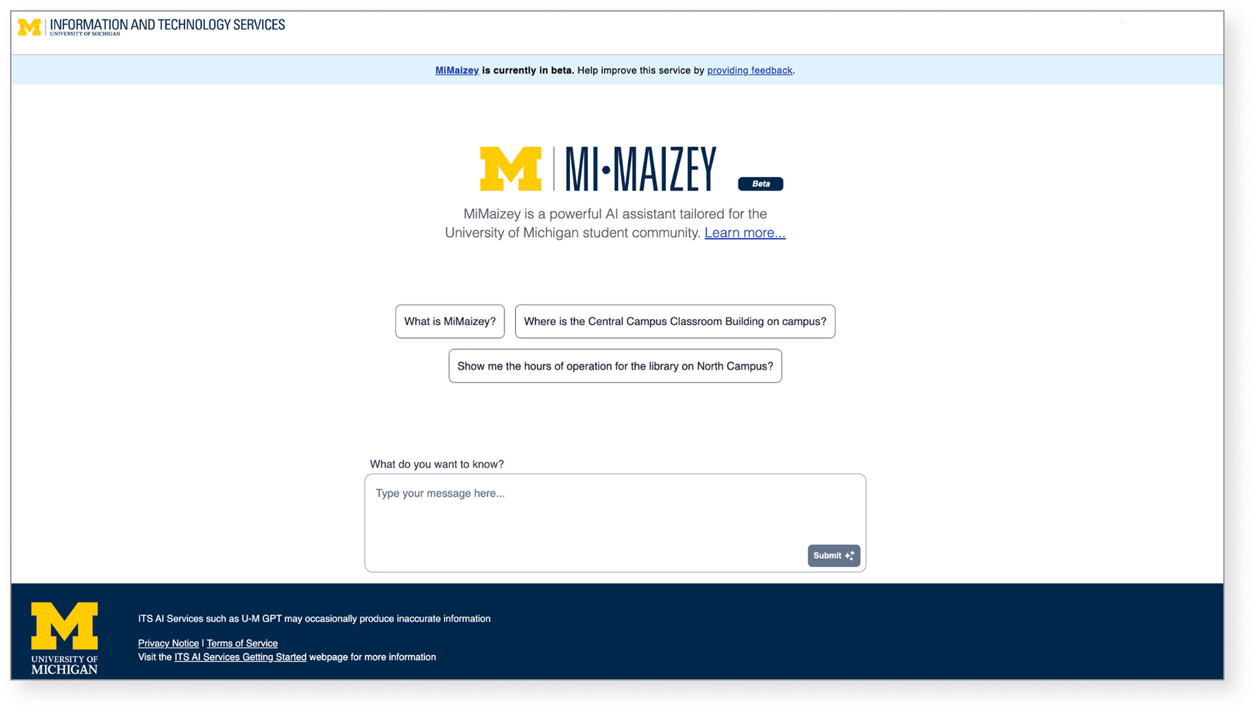 I want to dive deeper into the AI capabilities behind MiMaizey to design features that feel even more personalized and adaptive. This could include creating task-specific workspaces (like studying, drafting, organizing sources, etc.), enabling more customized student profiles, and exploring ways to integrate additional UM services and campus systems directly into the experience. Expanding these connections would allow MiMaizey to become a more holistic academic assistant, maximizing the capabilities of AI to deliver smarter, more context-aware support across a student’s entire workflow..