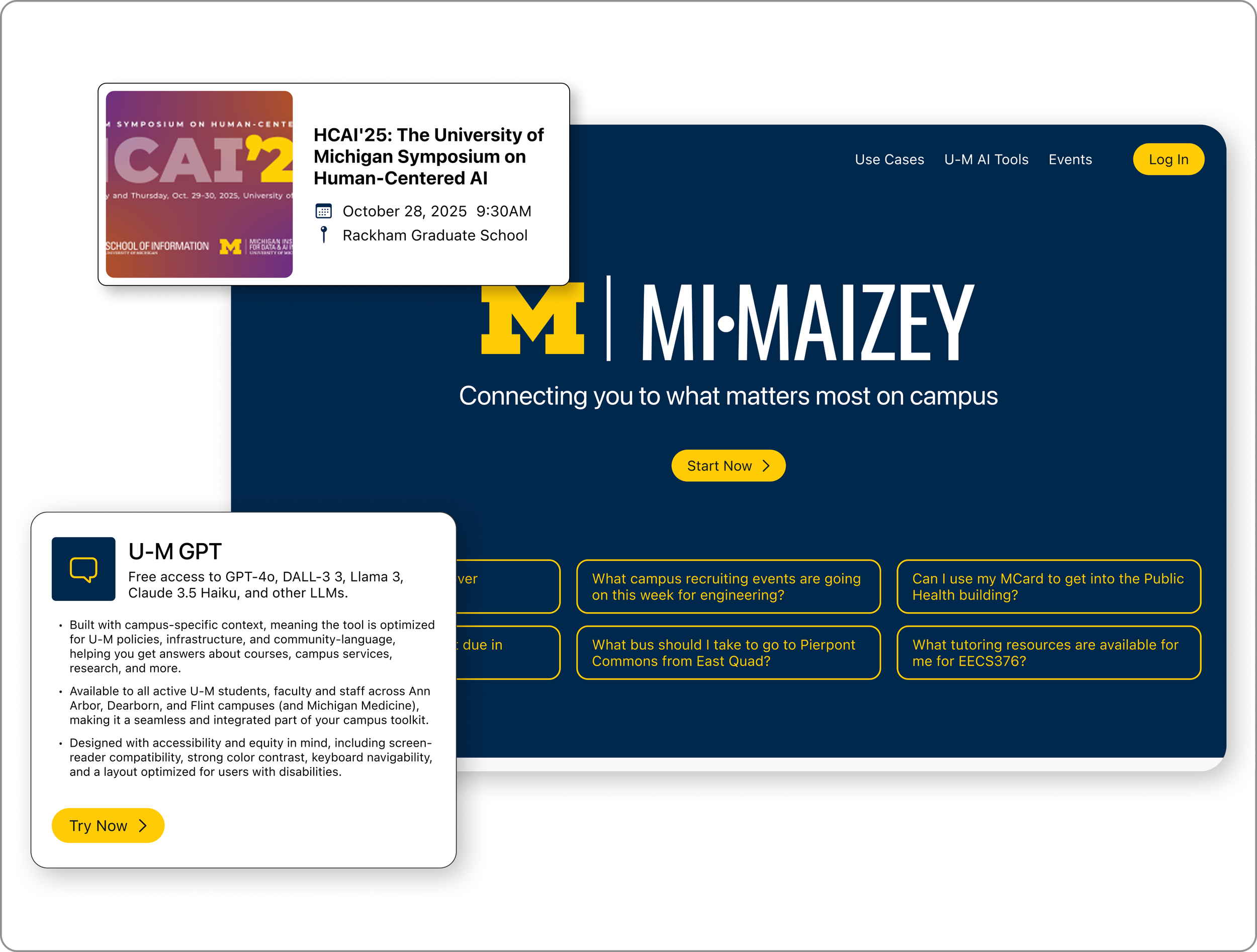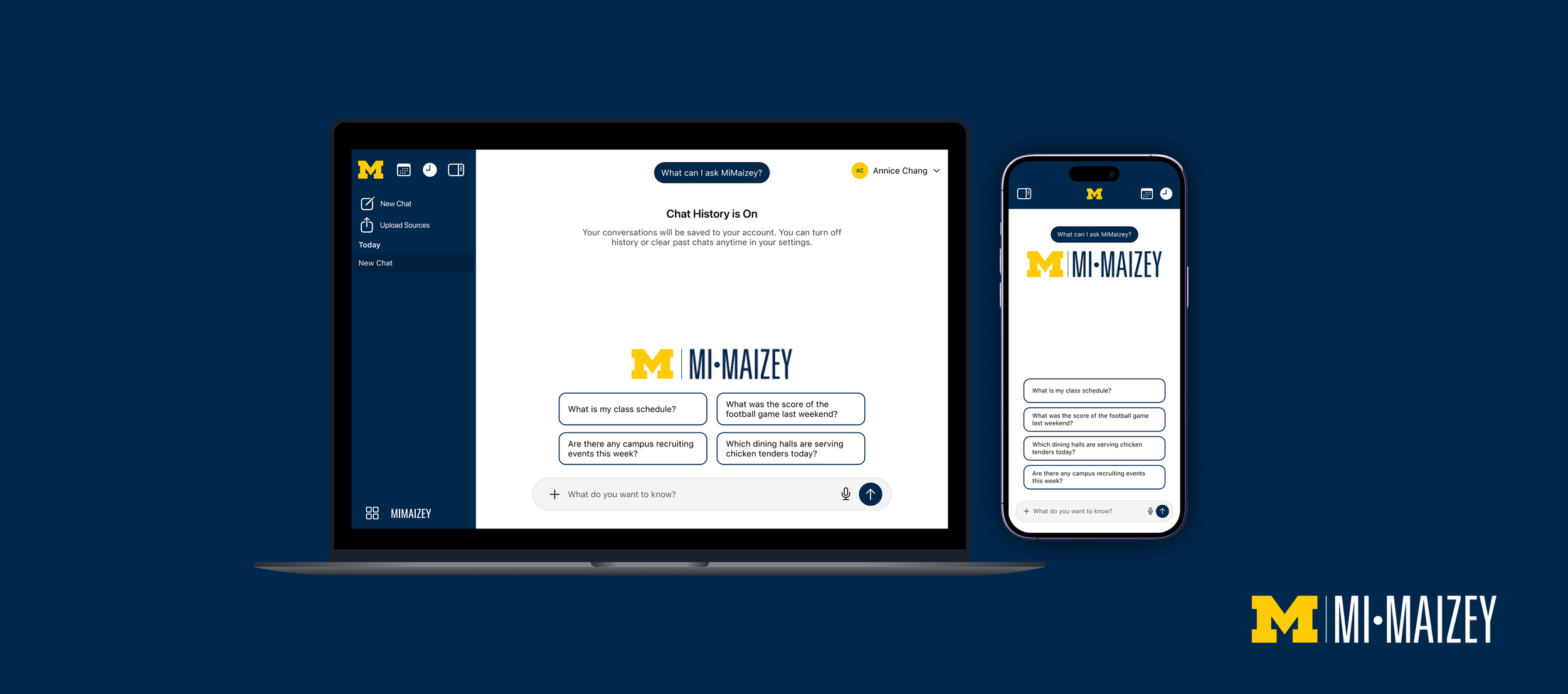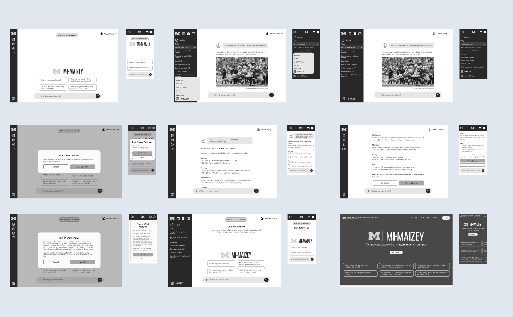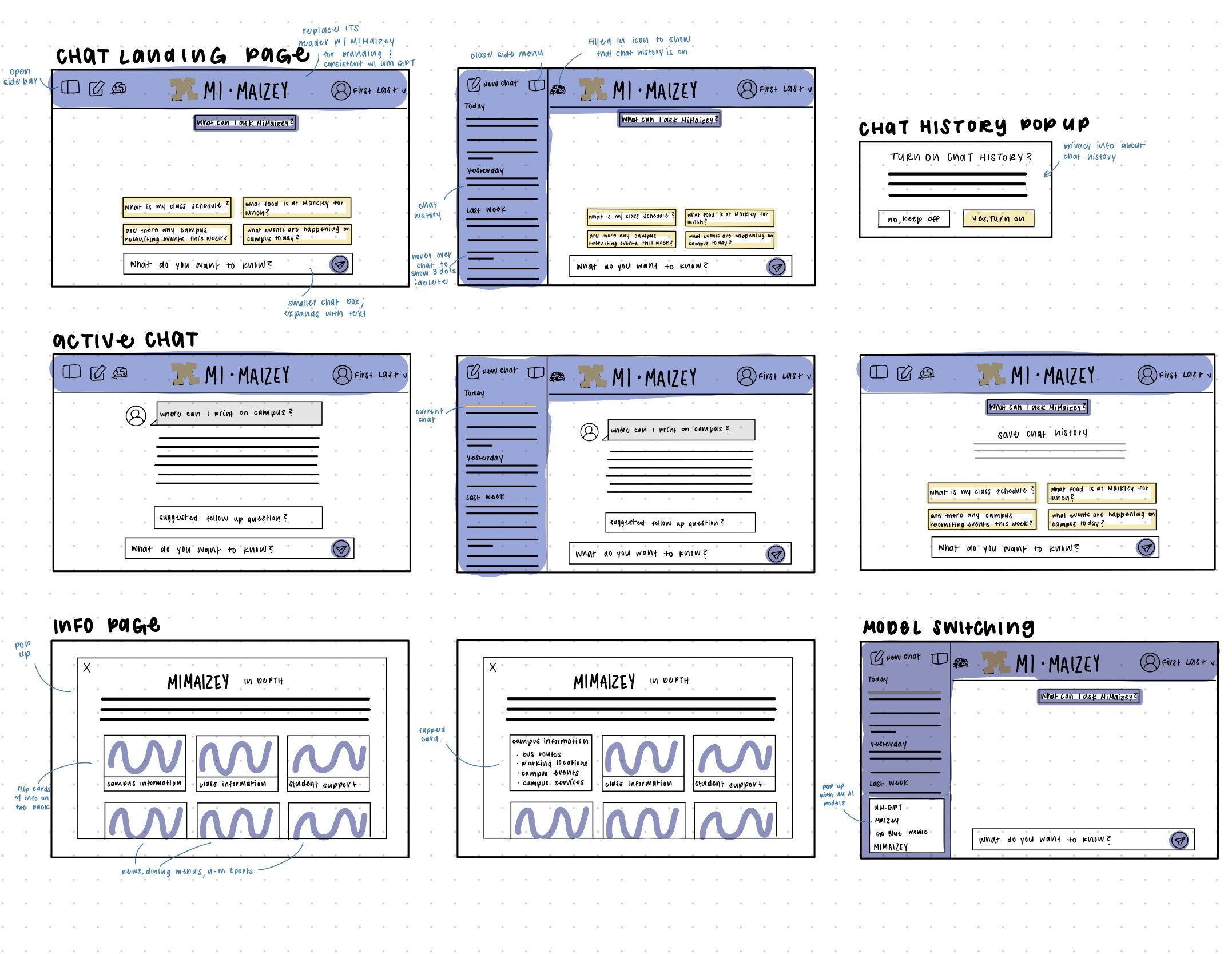 MiMaizey is one of the University of Michigan’s official AI services, designed to help students and faculty access campus information, resources, and workflows through a conversational interface. Unlike GenAI tools like ChatGPT, MiMaizey is built specifically for the U-M community, offering secure, university-trained responses and deeper integration with campus systems. This redesign project was completed in collaboration with a client from the University’s AI department, who challenged our class to reimagine how these tools could better engage users and highlight their unique value. My work focused on enhancing MiMaizey’s usability, visibility, and overall appeal to make it a more seamless part of students’ academic experience.