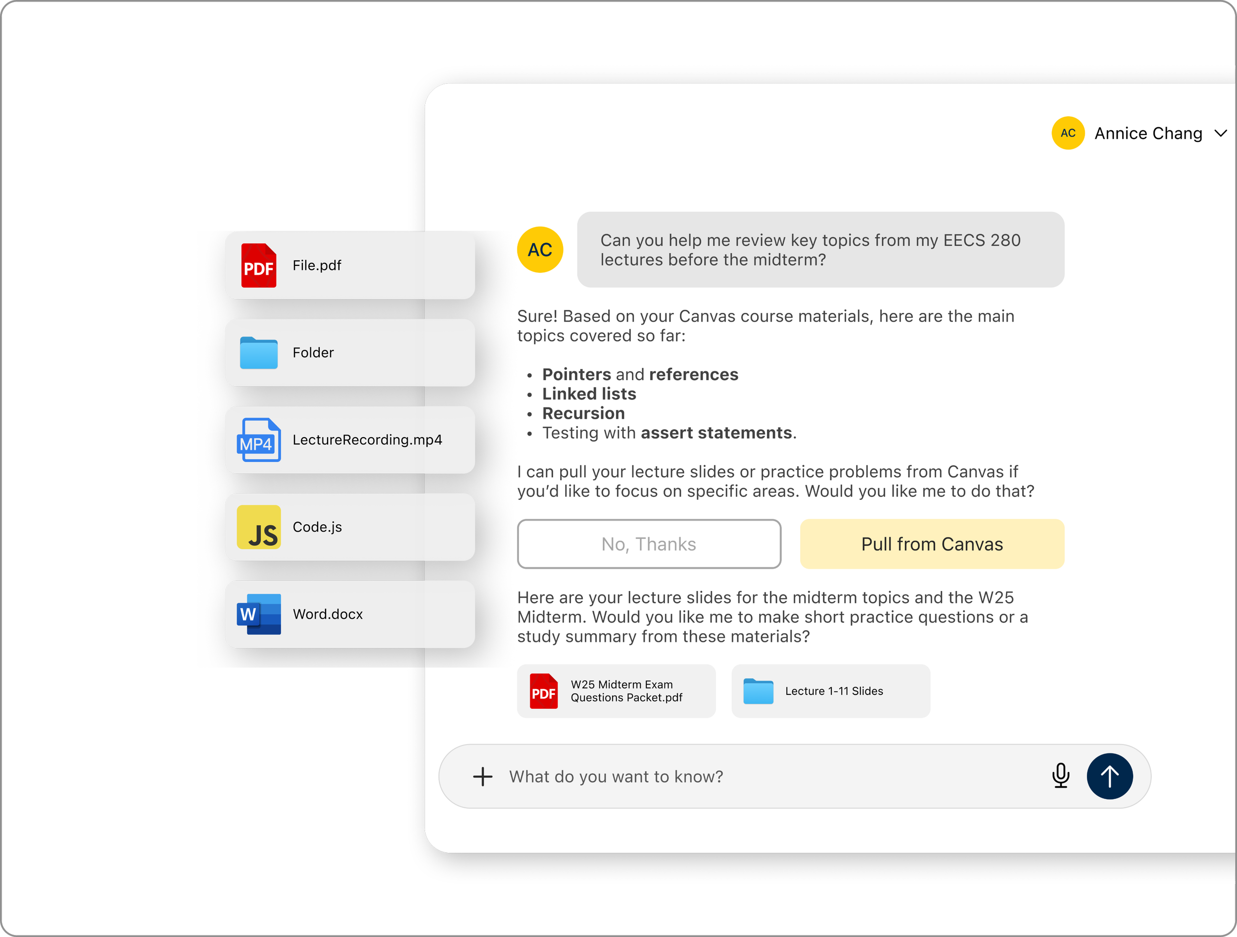 The assistant can pull course materials, documents, and resources directly for the student when needed.
