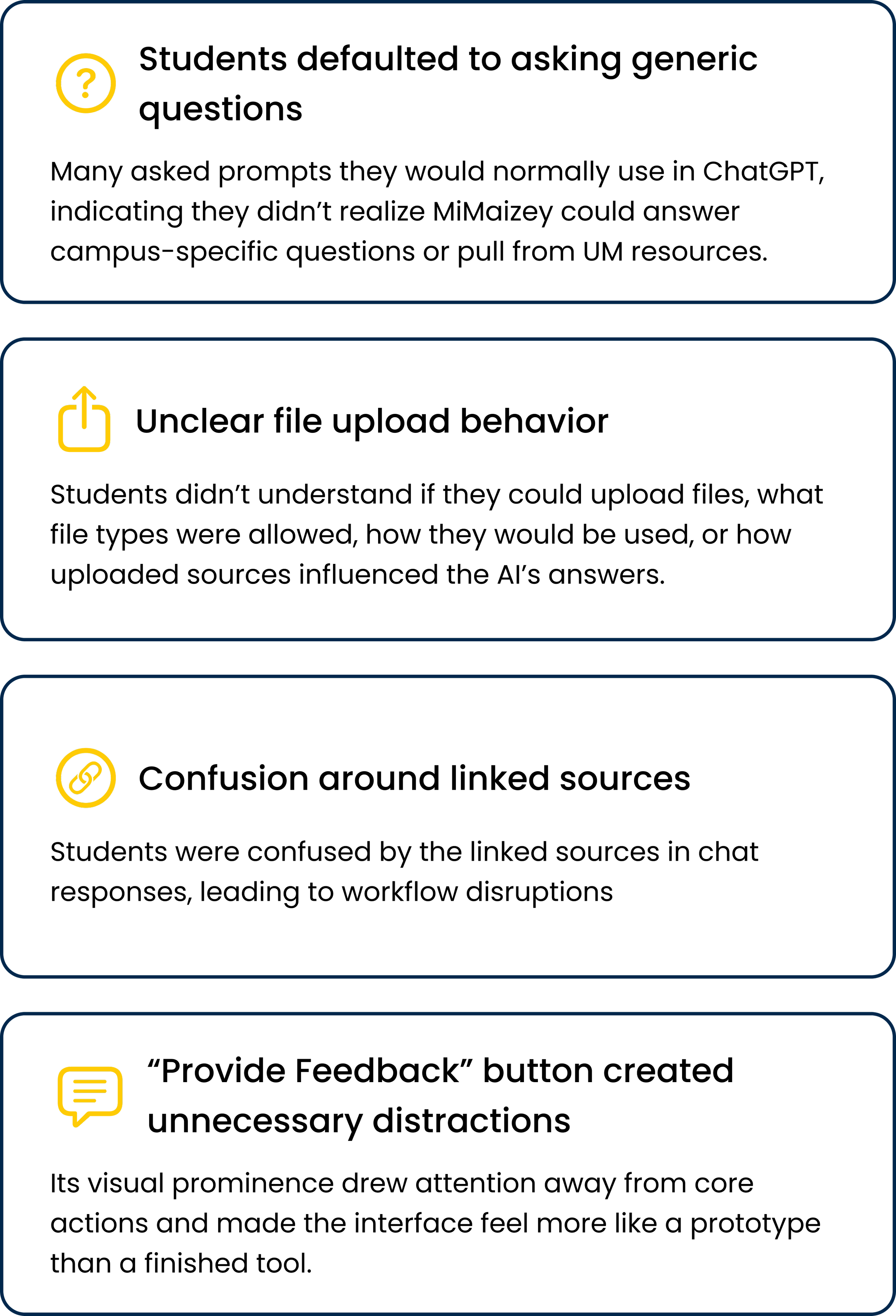 To inform early ideation, I ran a small round of informal usability tests and feedback sessions with students who had briefly interacted with the existing MiMaizey interface. A few consistent themes emerged: